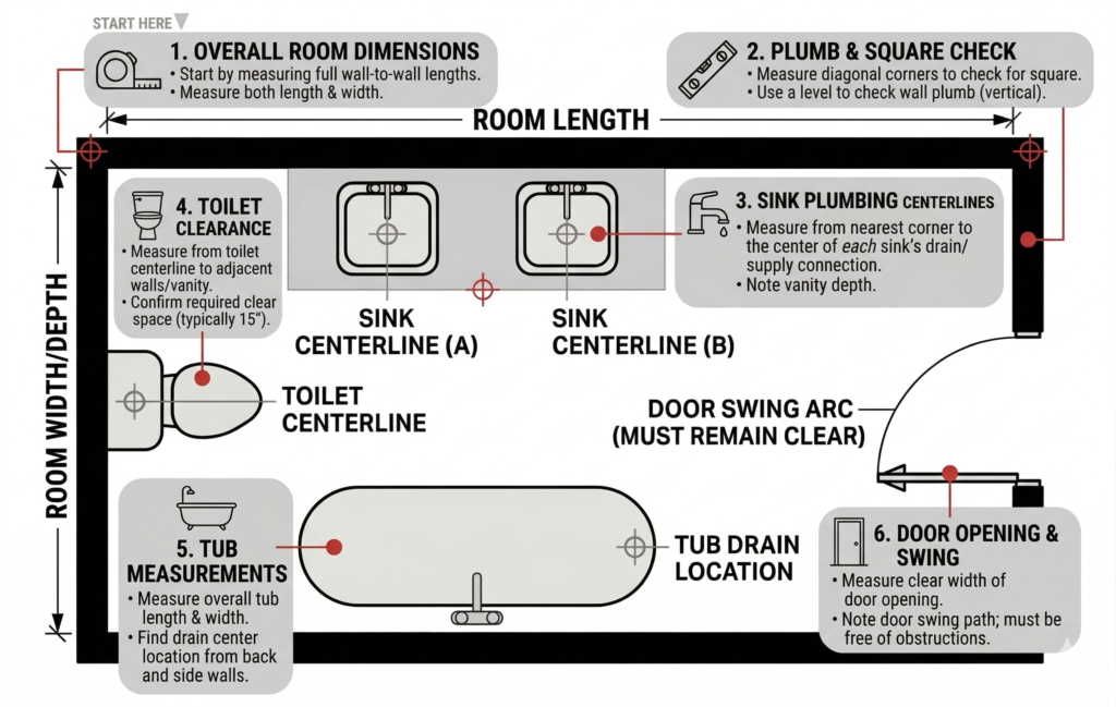 Before you choose a layout or buy fixtures, measure your existing space accurately. Mistakes here are expensive.