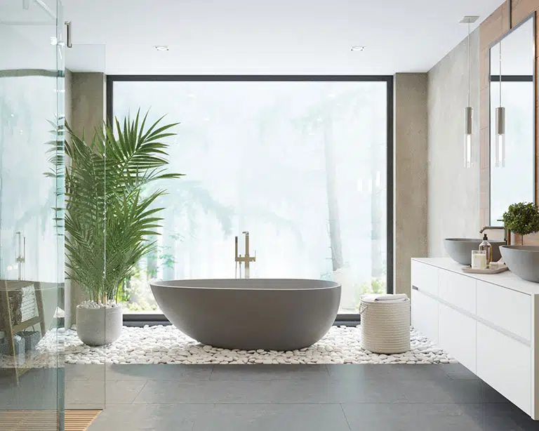 To match the feel of a modern bathroom, consider a darker-tone ceiling. This blends well with stone floors and wooden accents to create a warm-feeling room with a nice visual contrast.