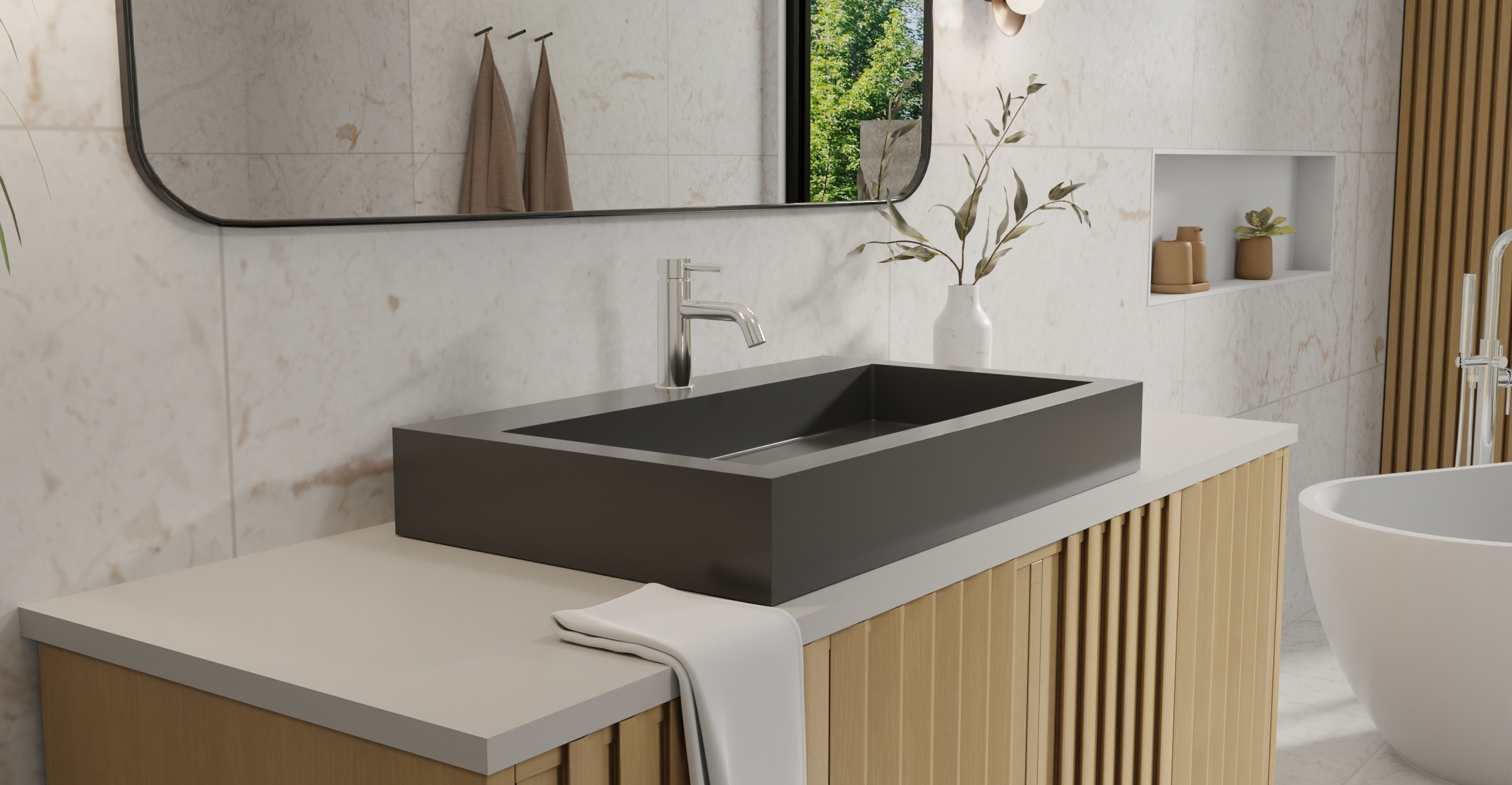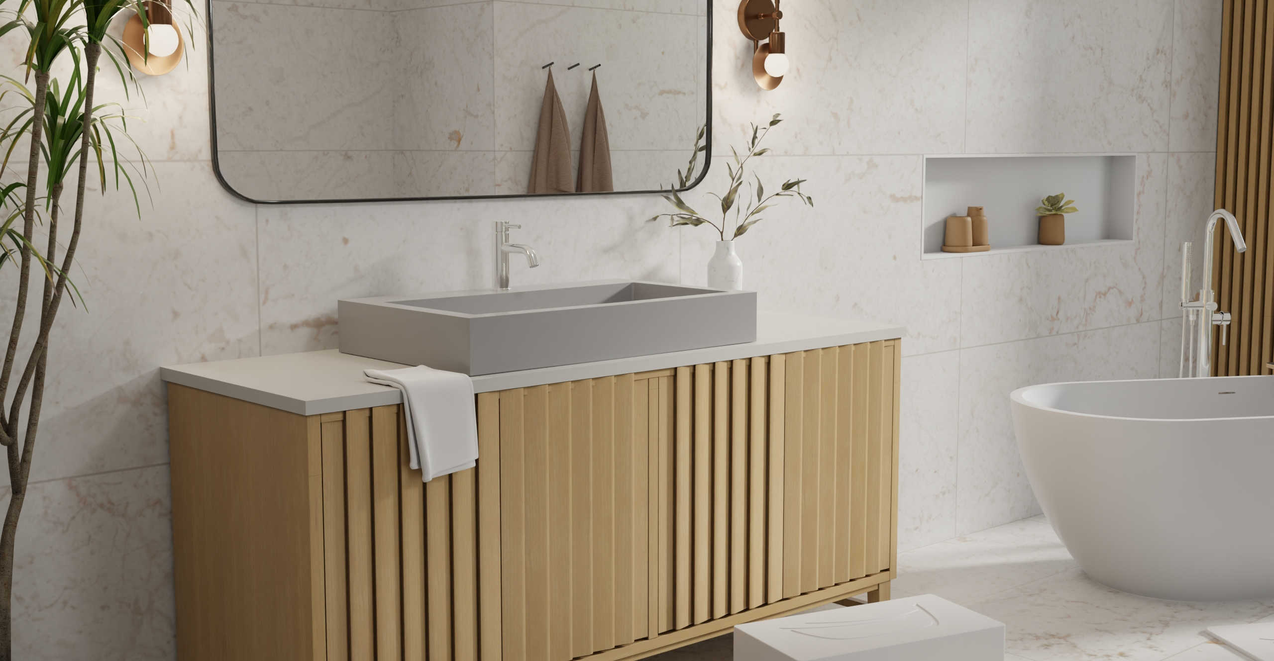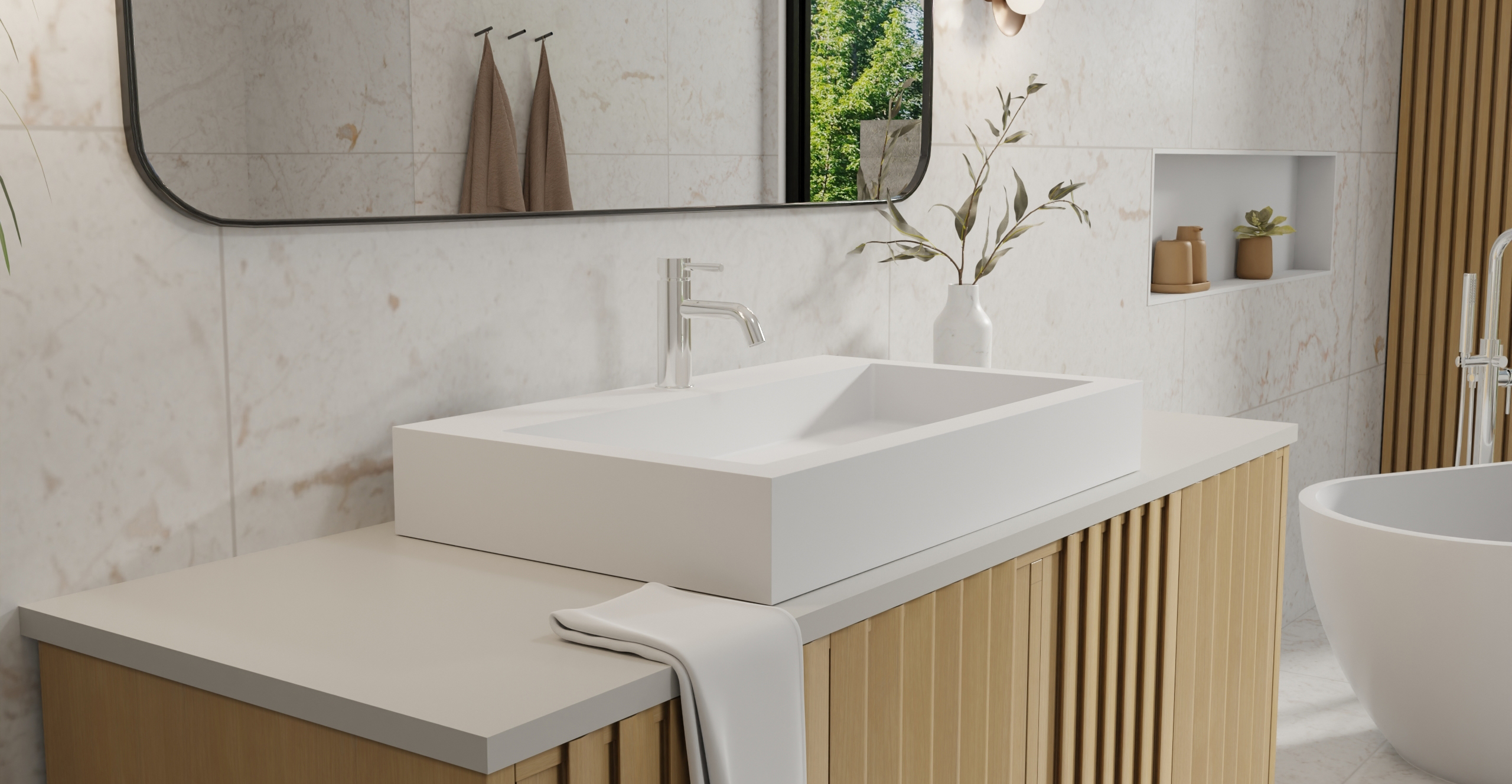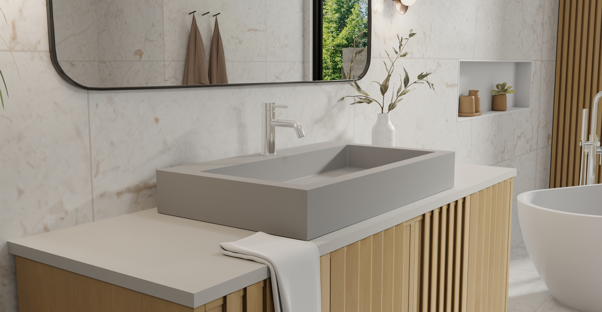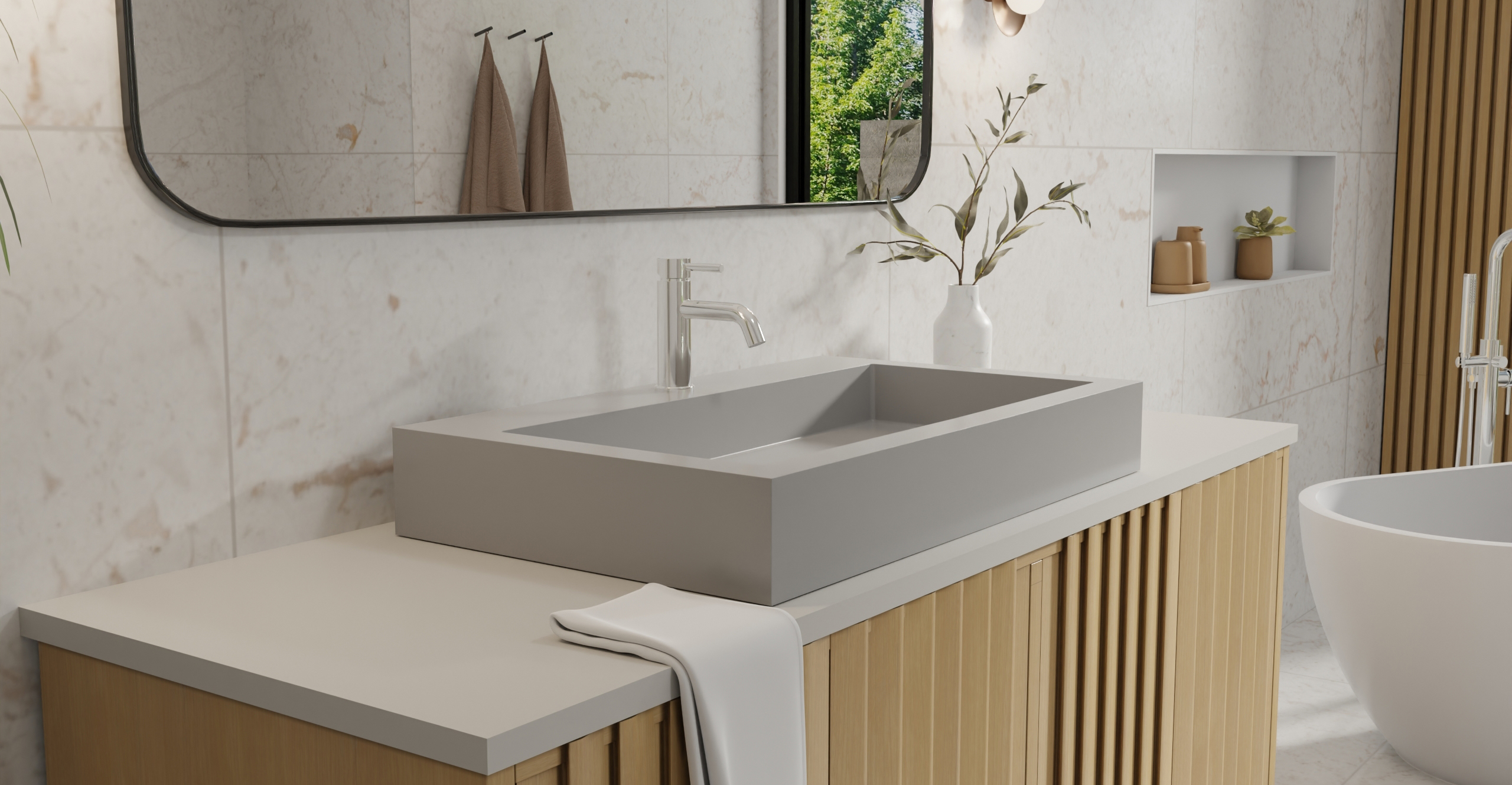 Envision your luxury bathroom with free templates and samples of Badeloft’s stone resin material.