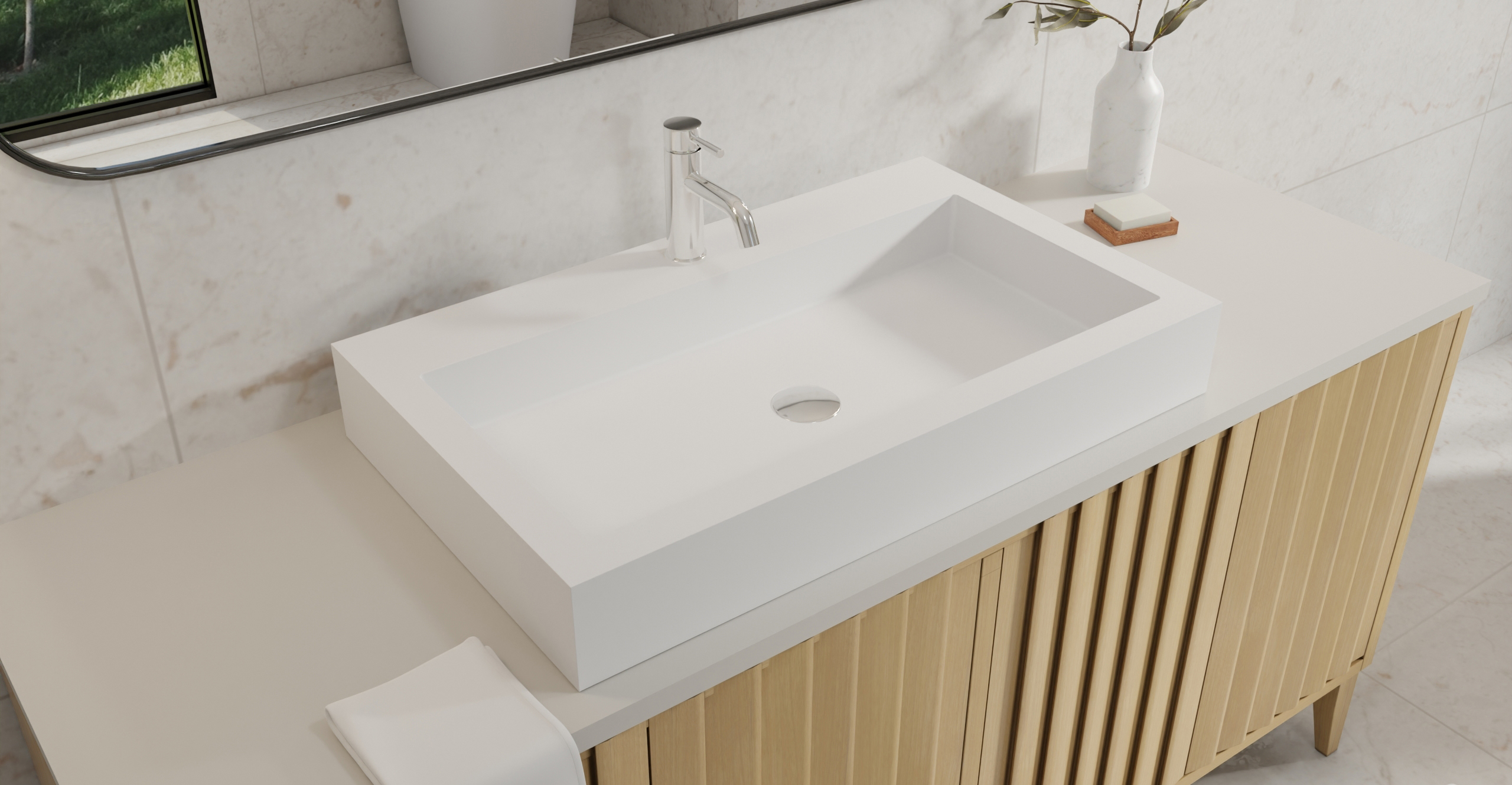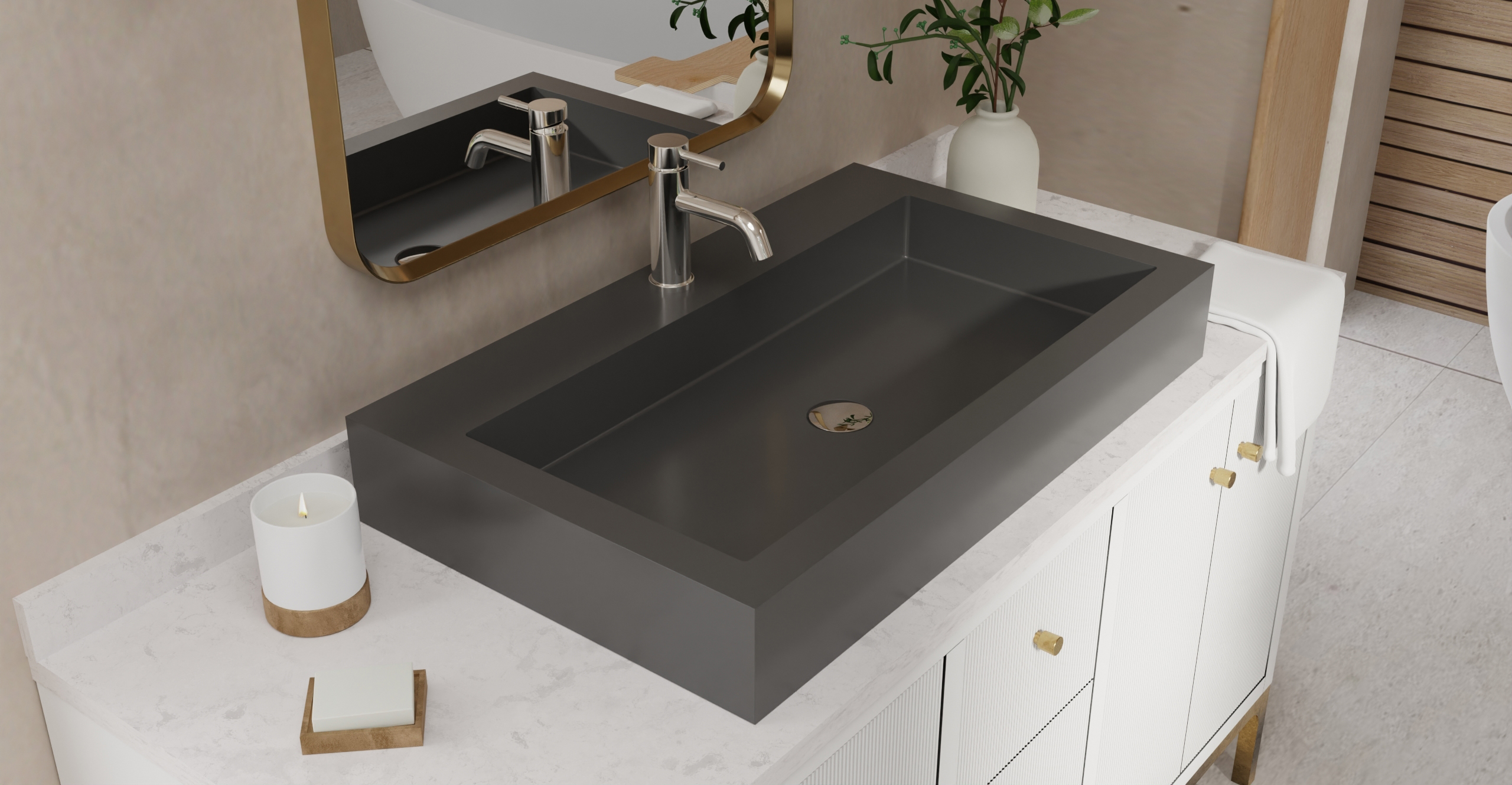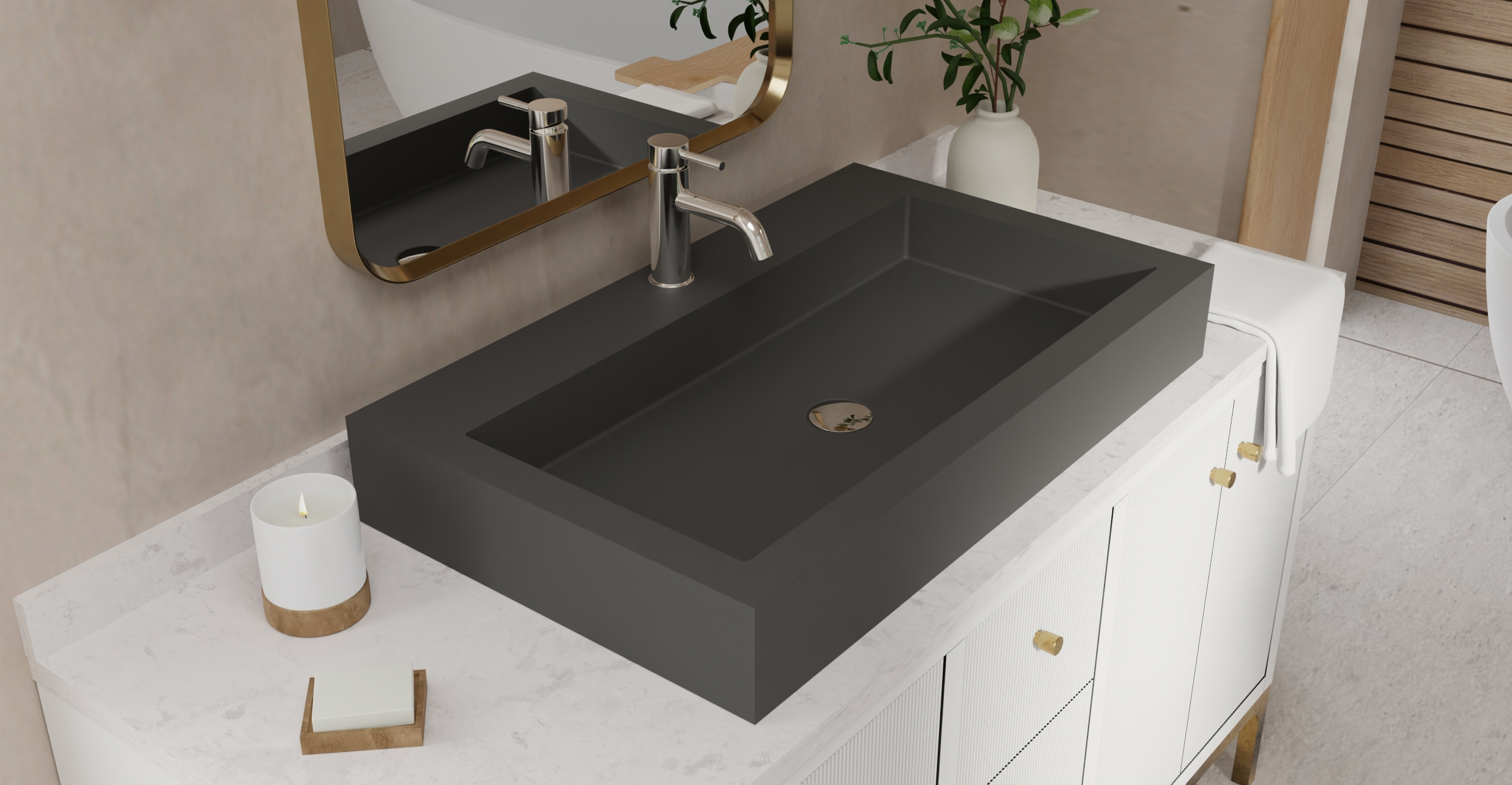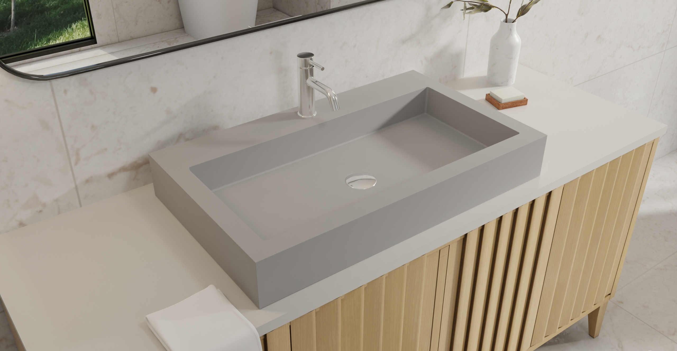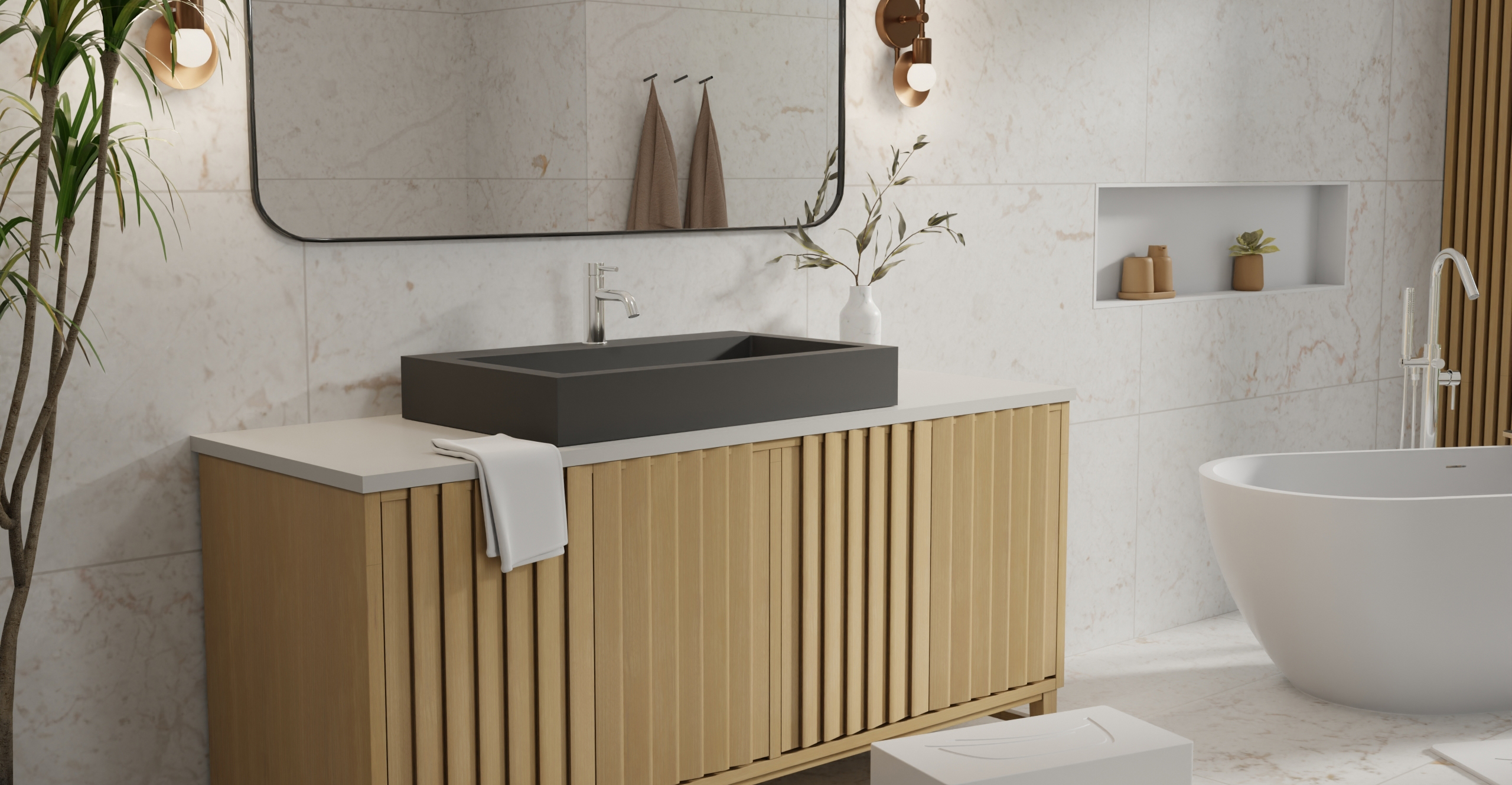 Envision your luxury bathroom with free templates and samples of Badeloft’s stone resin material.