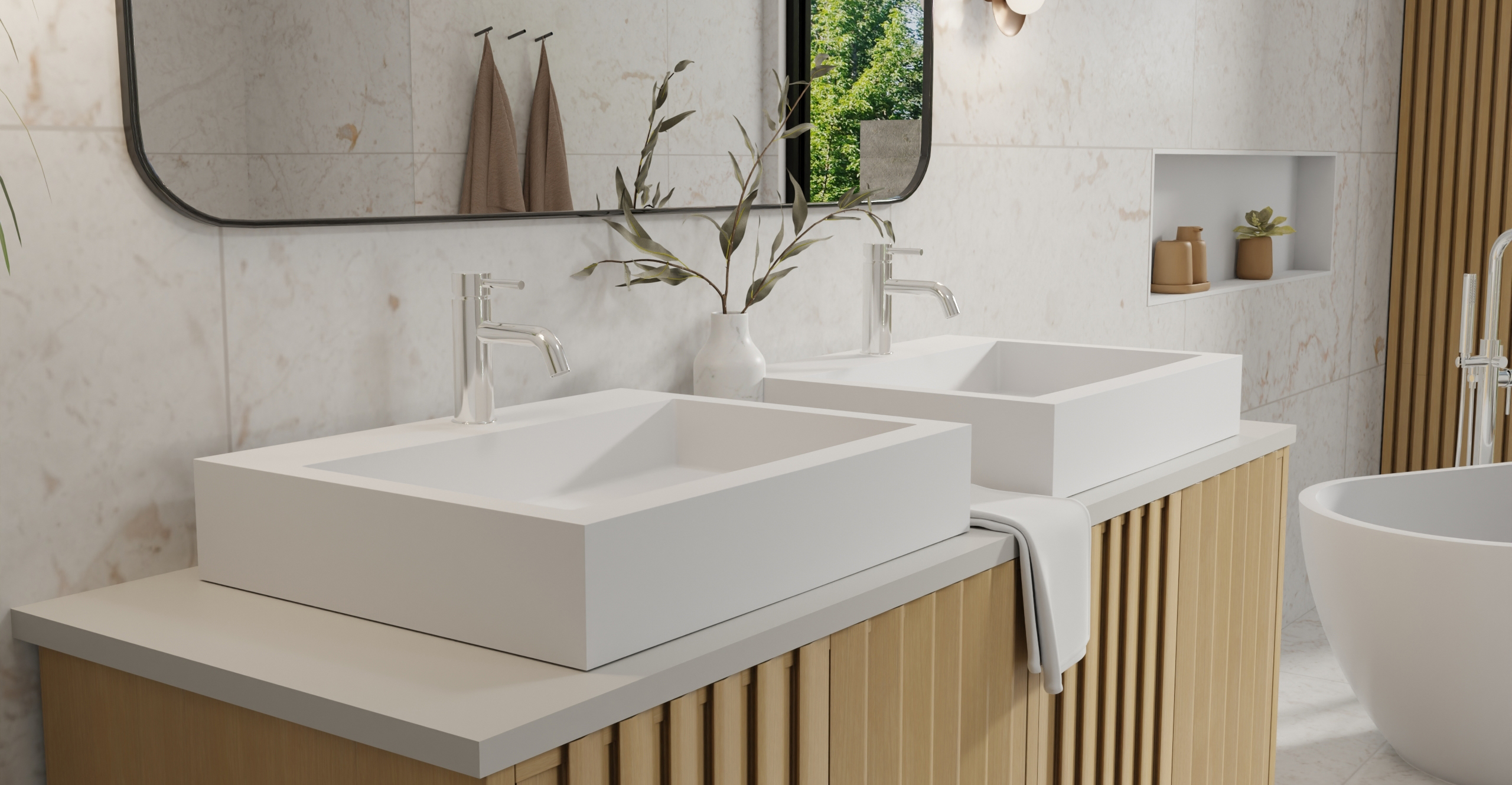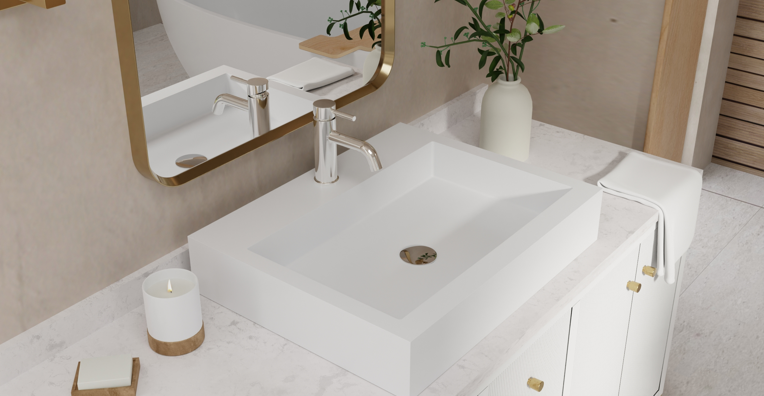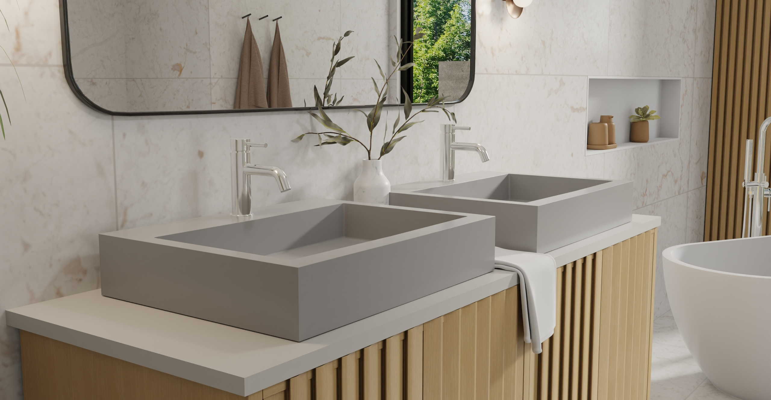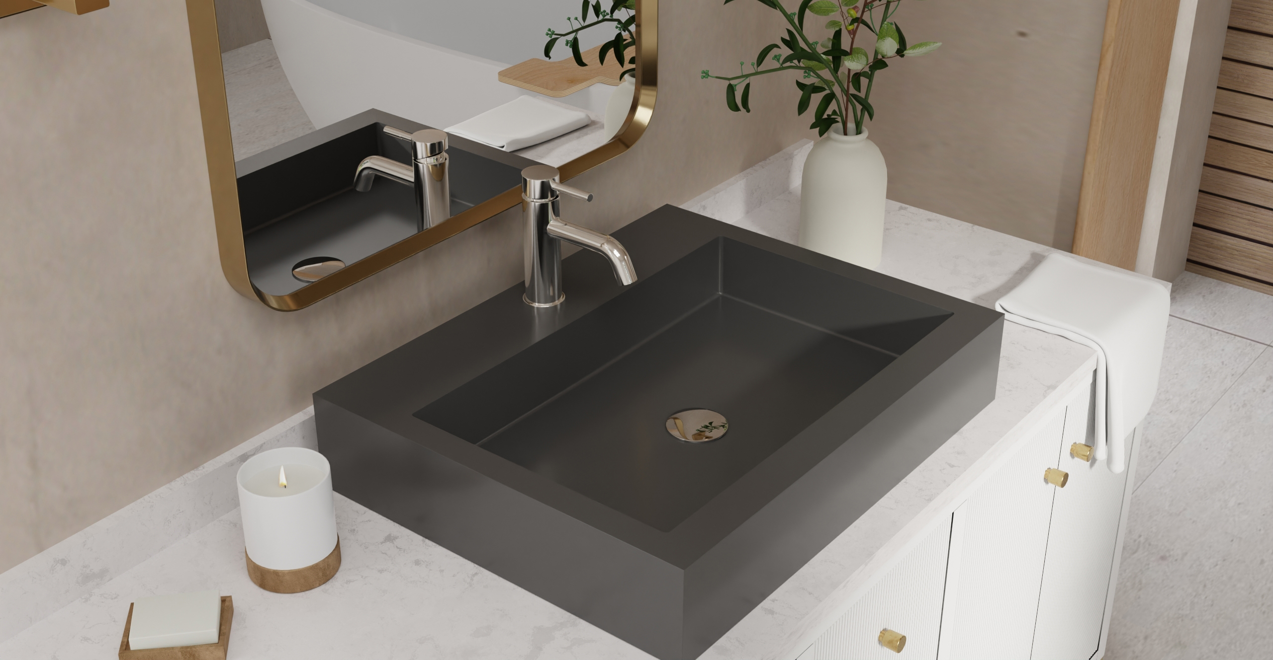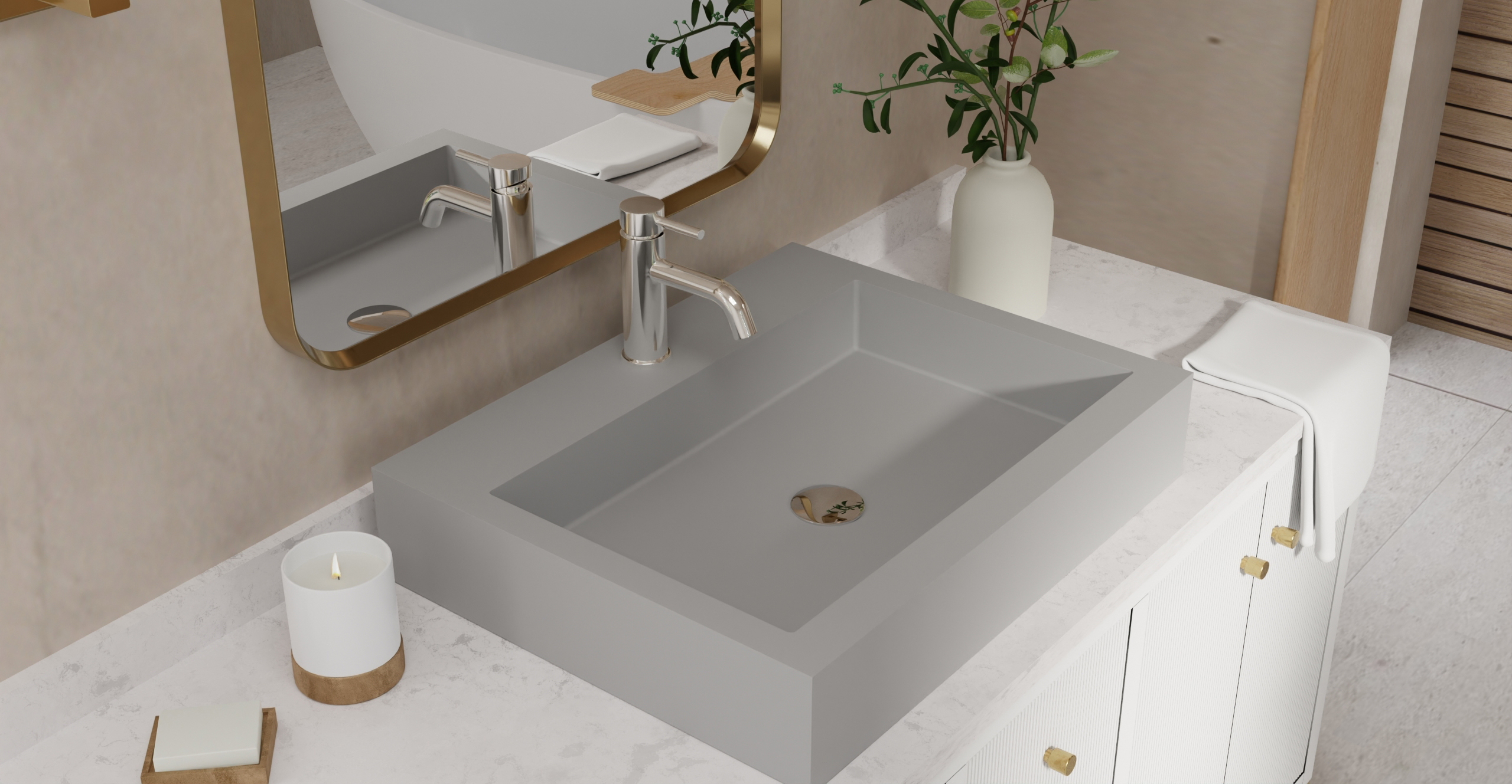 Envision your luxury bathroom with free templates and samples of Badeloft’s stone resin material.