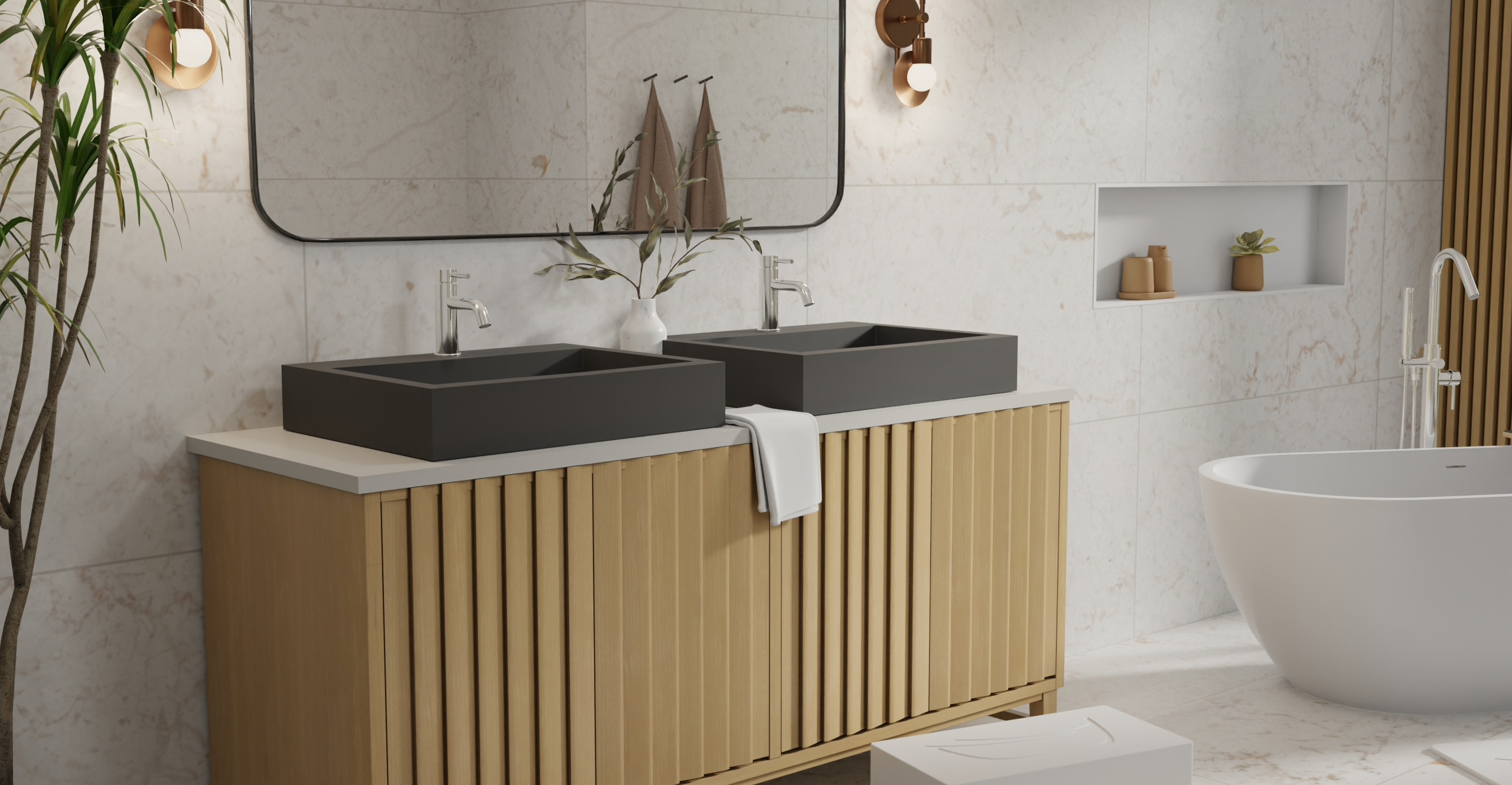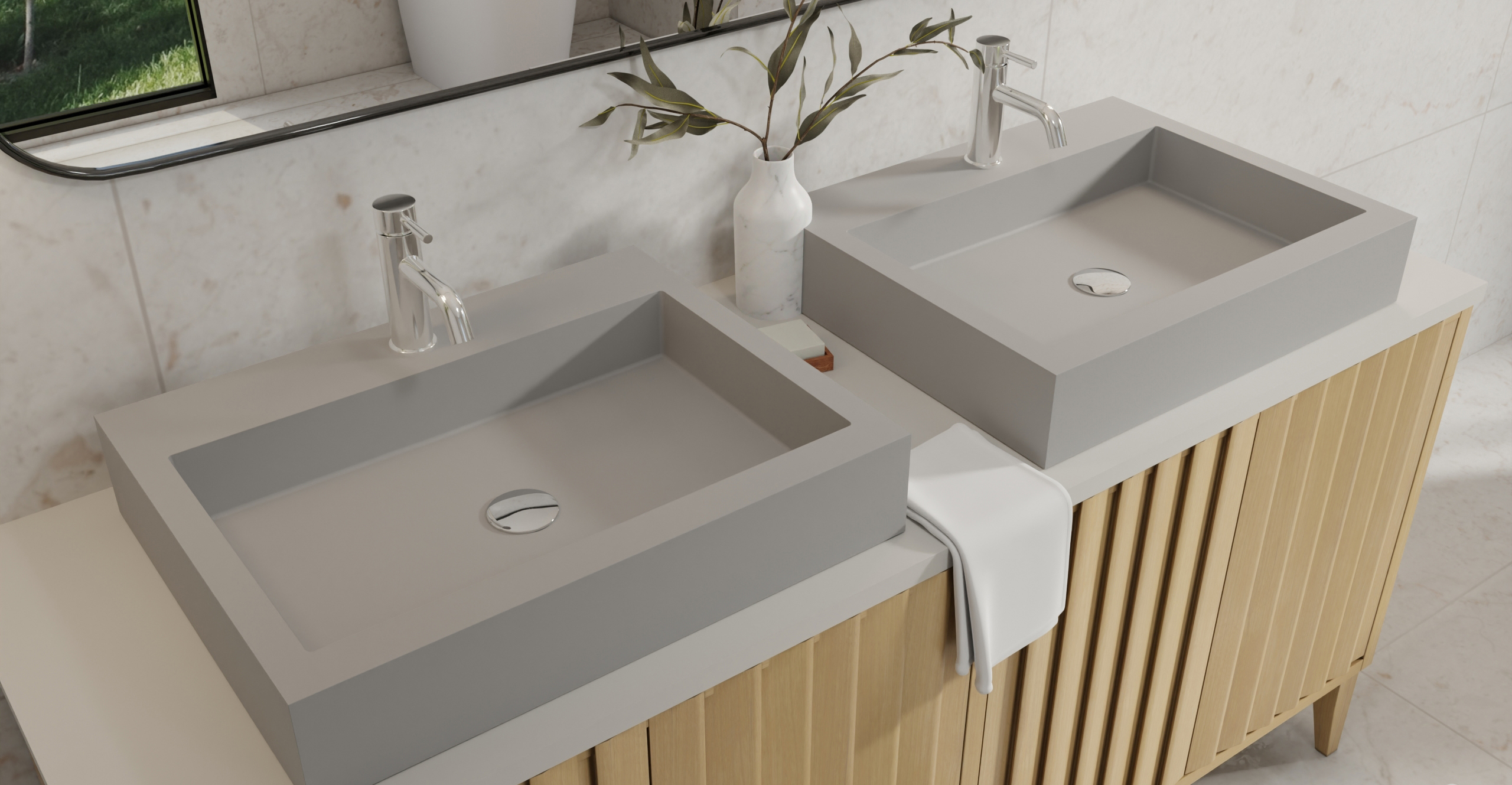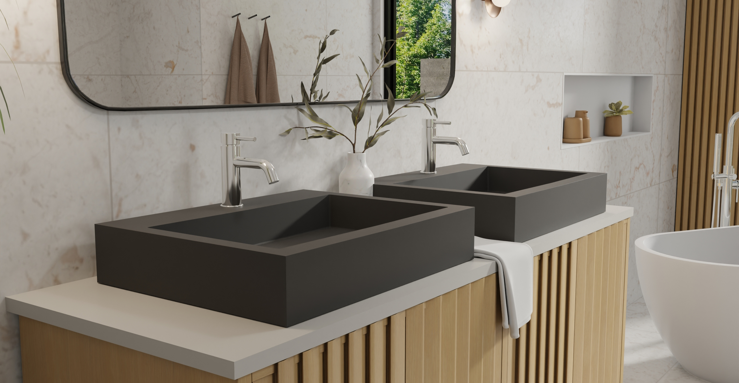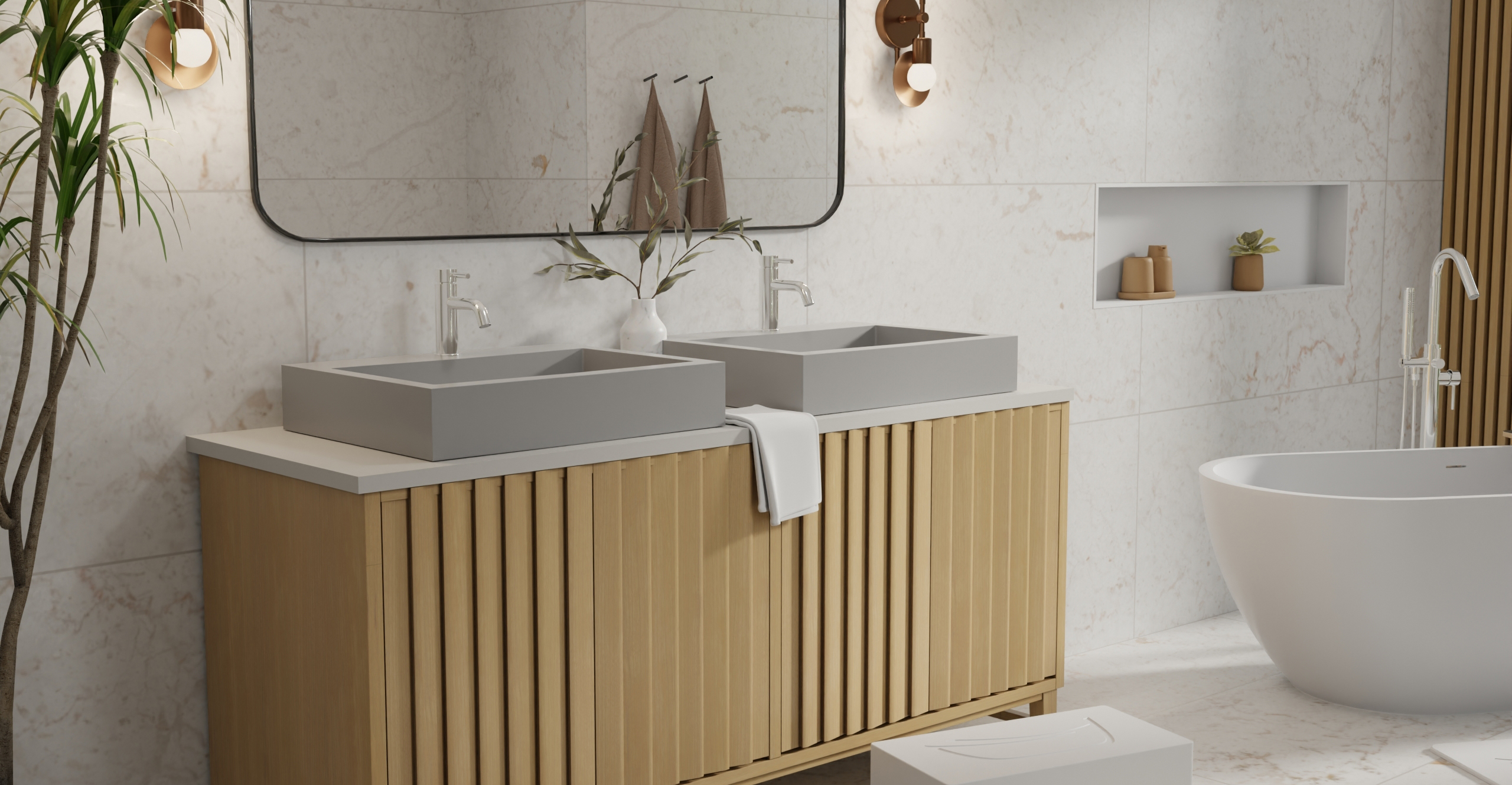 Envision your luxury bathroom with free templates and samples of Badeloft’s stone resin material.
