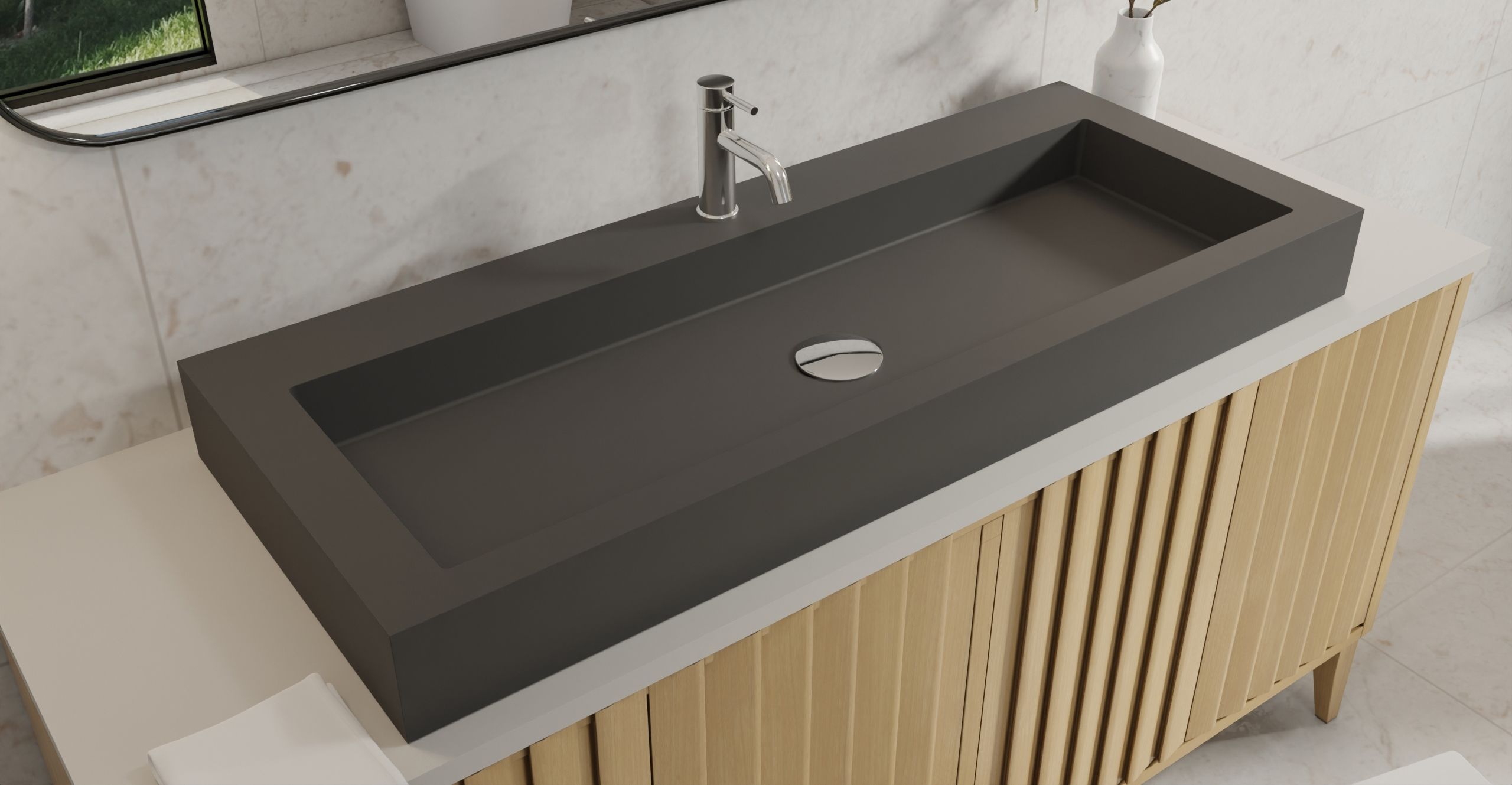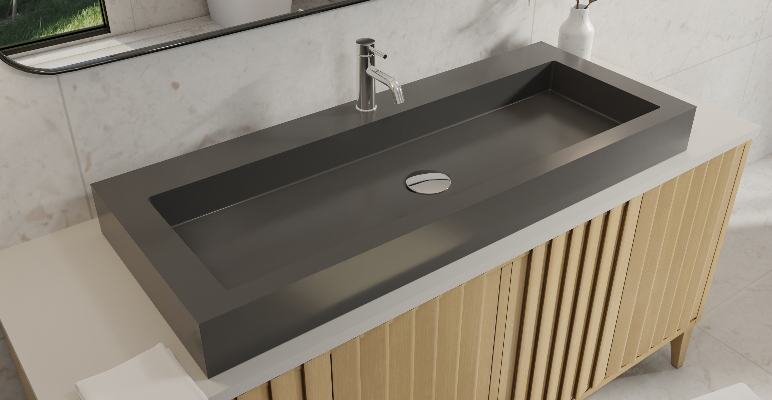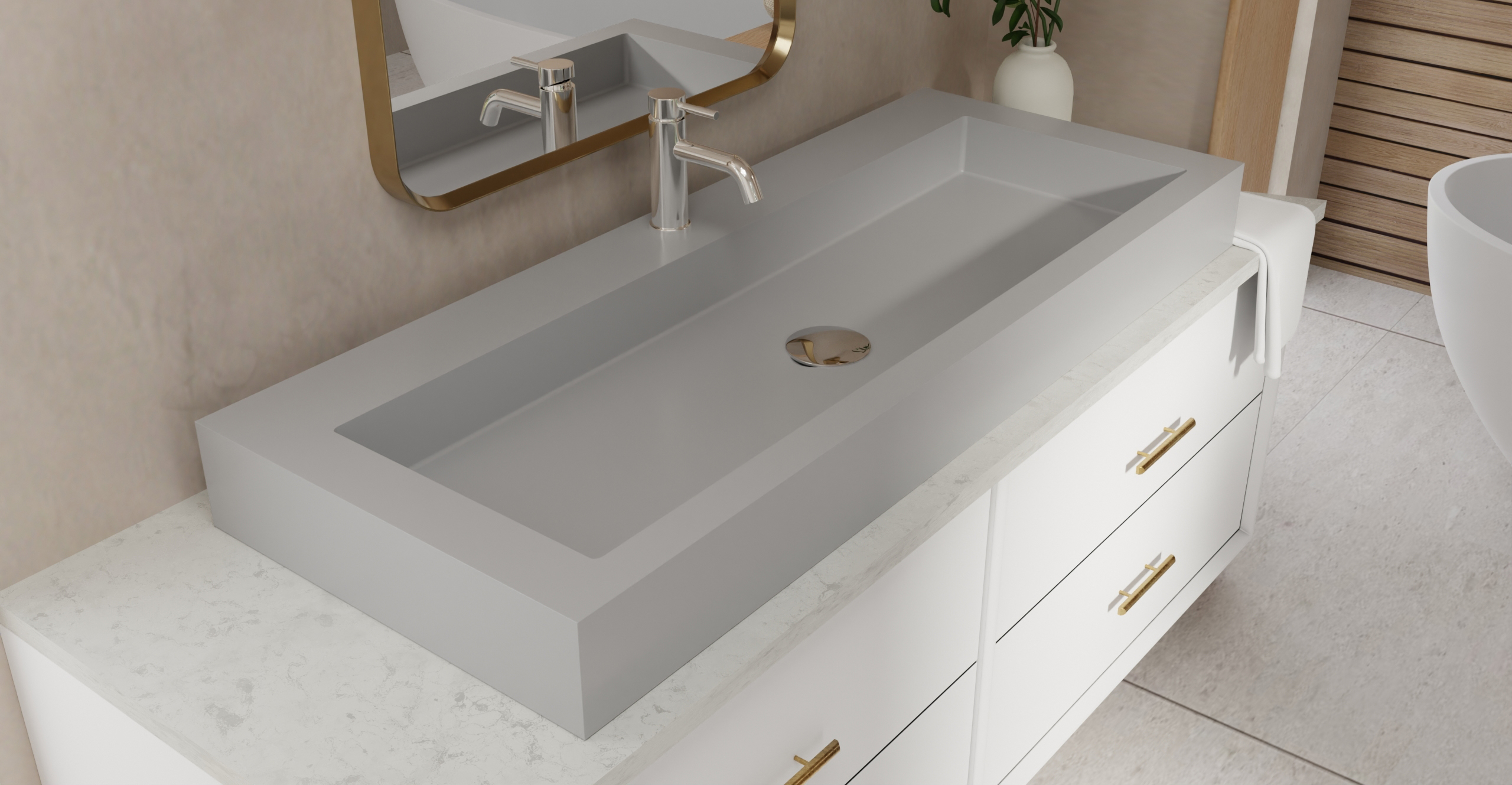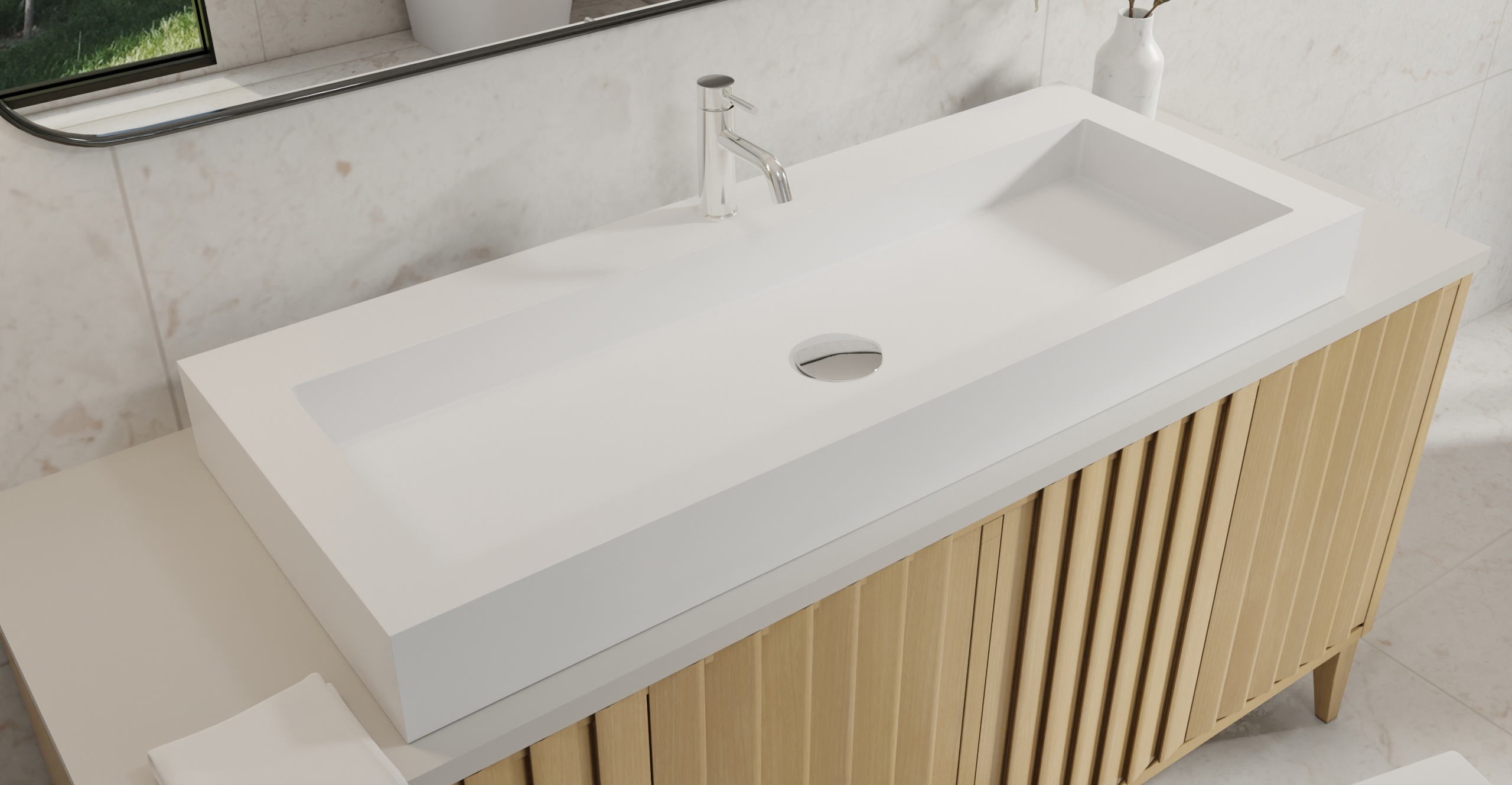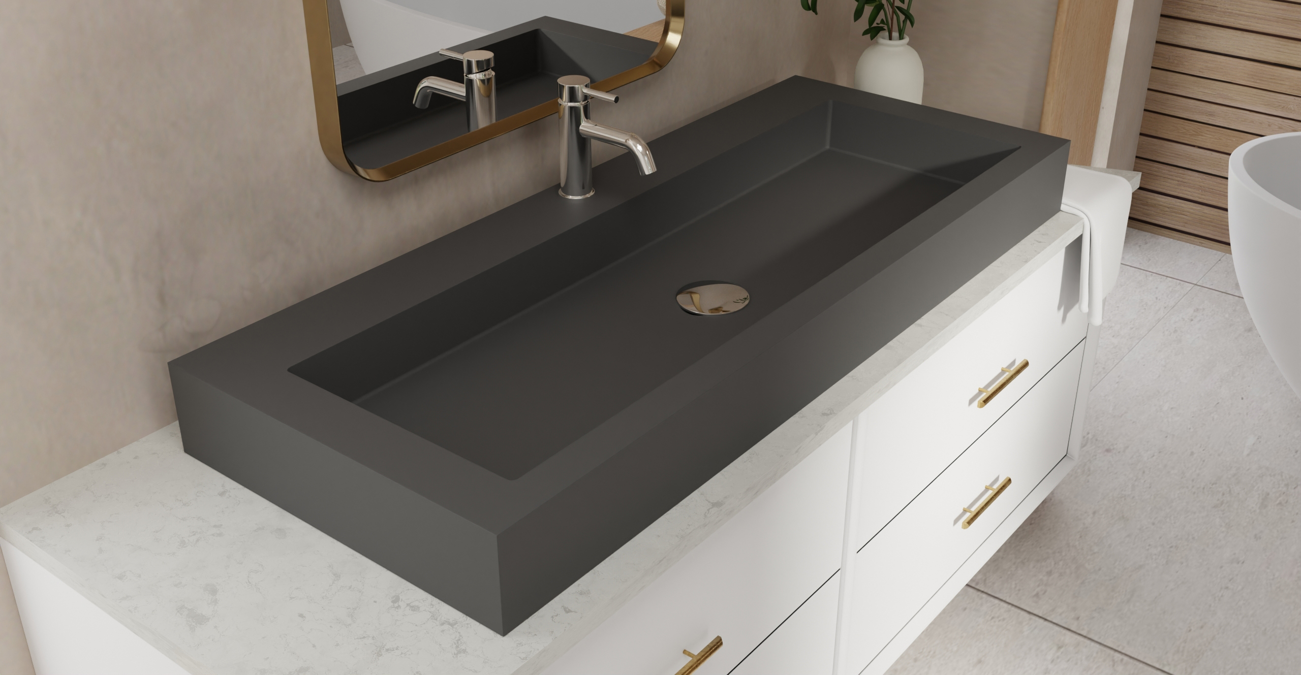 The Badeloft Countertop Sink WB-05-XXL is the largest of Badeloft’s above-counter rectangle sinks. Fit for the most spacious luxury baths in private homes and commercial spaces, the 4-foot long basin easily accommodates three or more simultaneous users. The sink’s unique bold borders accentuate its hard angles—a complement to contemporary and minimalist décor. The wide borders also provide practical space for toiletries and soaps. The sink is made of stone resin, a blend of natural marble and limestone. Stone resin is highly durable and an excellent insulator. It also has the pleasing feel of stone to the touch. Easy to clean and damage-resistant, this stone sink will look new for years to come. The WB-05-XXL includes a finish in matte or glossy white and a pop-up drain cap in a color of your choice. It is compatible with sink-mounted and wall-mounted faucets.