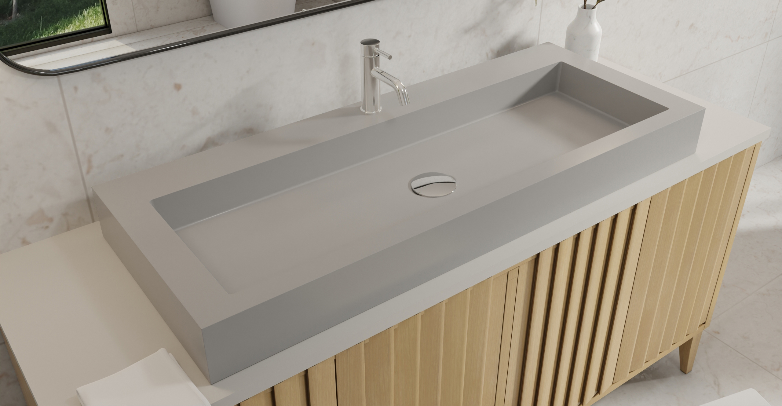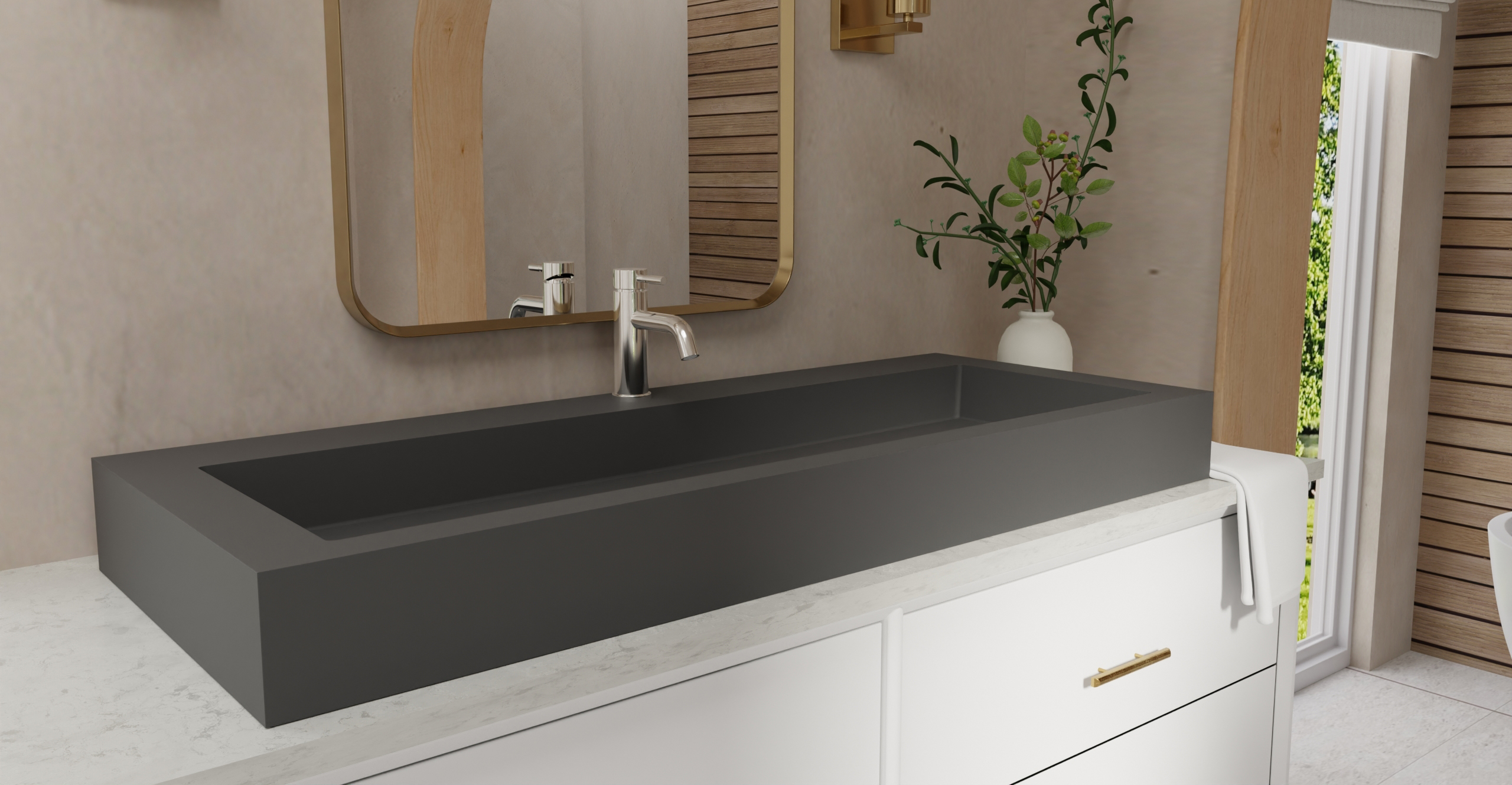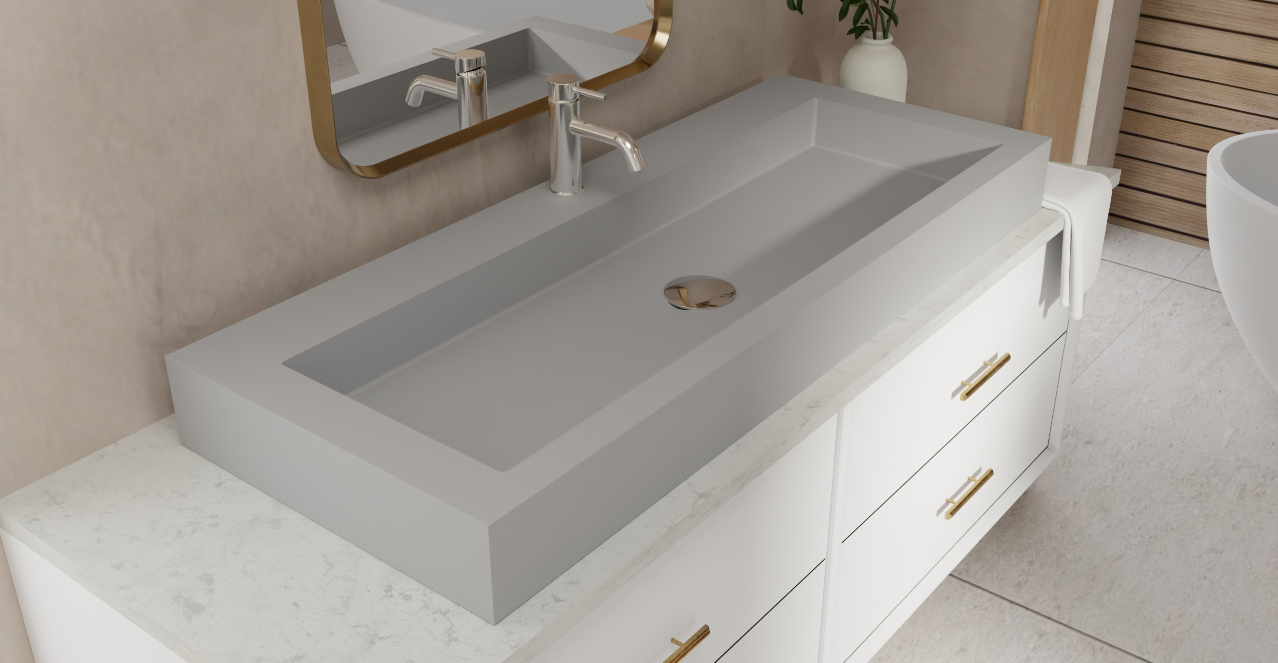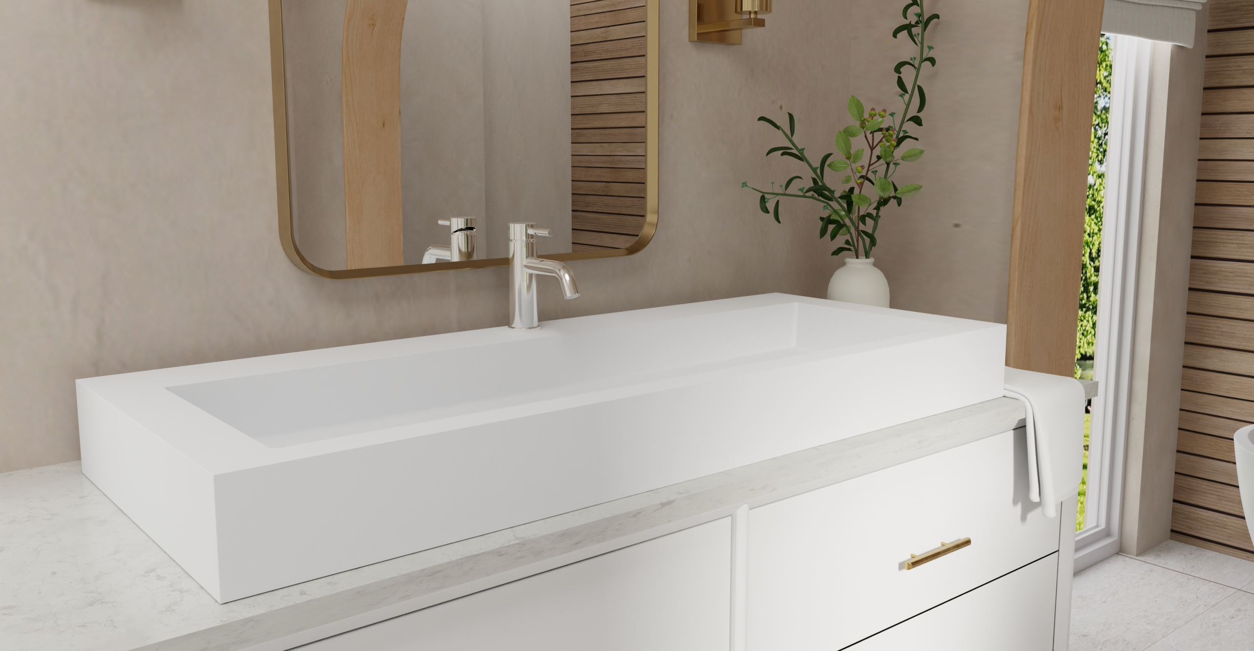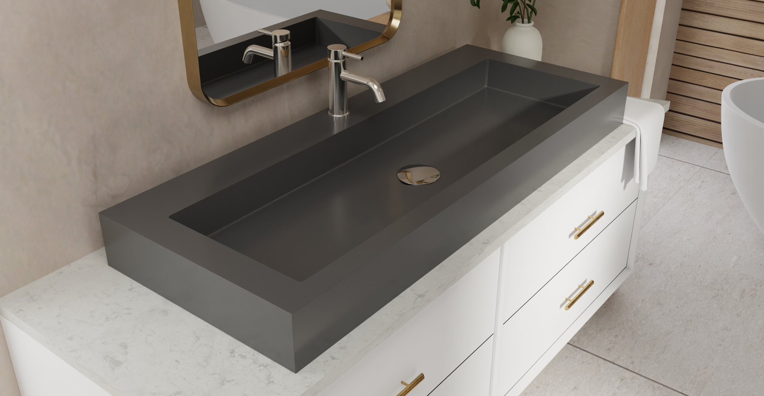 The Badeloft Countertop Sink WB-05-XXL is the largest of Badeloft’s above-counter rectangle sinks. Fit for the most spacious luxury baths in private homes and commercial spaces, the 4-foot long basin easily accommodates three or more simultaneous users. The sink’s unique bold borders accentuate its hard angles—a complement to contemporary and minimalist décor. The wide borders also provide practical space for toiletries and soaps. The sink is made of stone resin, a blend of natural marble and limestone. Stone resin is highly durable and an excellent insulator. It also has the pleasing feel of stone to the touch. Easy to clean and damage-resistant, this stone sink will look new for years to come. The WB-05-XXL includes a finish in matte or glossy white and a pop-up drain cap in a color of your choice. It is compatible with sink-mounted and wall-mounted faucets.